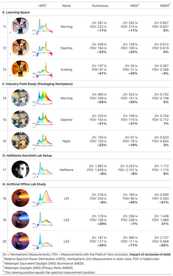 The FOV occlusion leads to a range of small to high reduction of the visual and non-visual quantities (−11% to −43%), depending on the scenario. This is quite a variation and can be attributed to the changing light settings between panel light and spotlight fixtures. The spotlight fixtures above the observers’ table are outside the FOV, and their increasing contribution to quantities from unoccluded measurements also changes the impact of the FOV occlusion quite dramatically. Whereas the dominant panel lights illuminate the vertical surfaces of the walls within the field of view in scenario 11, their relative contribution compared to the spotlights is gradually reduced over scenarios 12 and 13. Despite the variation of the impact of FOV occlusion, spectral differences remain negligible (changes in MDER 0 to −3%).