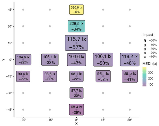 Graph of MEDI (lx) and the relative reduction of MEDI due to the FOV occlusion (impact, %), measured in 15° increments from a view straight ahead (0°/0°) in both horizontal (X) and vertical (Y) directions. The labels are scaled by MEDI (color) and impact (size). A small yellow label indicates a high MEDI value and a small impact, whereas a large blue label indicates a low MEDI value and a high impact. Measurements are from project D, with individual task lighting.