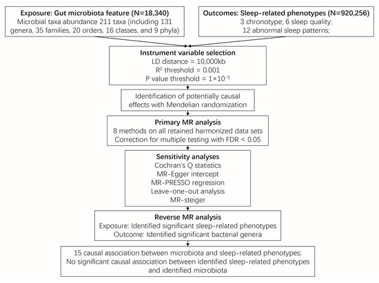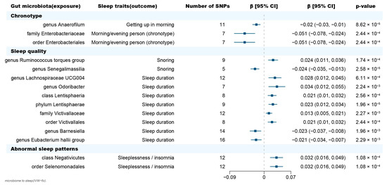 In contrast to observational studies, the utilization of Mendelian randomization (MR) analysis capitalizes on the inherent characteristics of common genetic variations relating to modifiable environmental exposures that are of interest. This approach has gained significant popularity as a means to investigate the possible causal connections between environmental exposures and diseases [17,18,19]. Two-sample MR analysis incorporates data from separate Genome-Wide Association Studies (GWASs) on single-nucleotide polymorphisms (SNPs) related to the exposure and the outcome of interest. This approach allows for the calculation of a single causal estimate. As the number of GWASs focusing on the gut microbiota and various diseases continues to increase [20,21], there is now a greater abundance of large-scale summary statistics data available. This abundance has greatly enhanced the statistical power of two-sample MR analysis. In this research, we examined the causal relationship between the gut microbiota and sleep-related traits and diseases by conducting a comprehensive two-sample MR analysis of three kinds of sleep-related phenotypes derived from the IEU Open GWAS project, including chronotype (chronotype and getting up in morning), sleep quality (sleep duration, snoring and nap during day), and abnormal sleep patterns(insomnia, narcolepsy, disorder of the sleep-wake schedule, sleep disorders and sleep apnoea). Several taxa that play a causal role in the chronotype, sleep duration and the risk of both insomnia and snoring were further identified which contributes to exploring the mechanism.