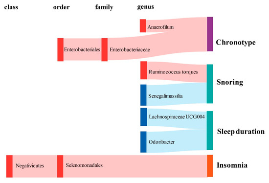 Considering abnormal sleep patterns, two taxa were found to be associated with increased insomnia risk in our results (Figure 3). Both the order Selenomonadales and class Negativicutes were risk taxa for insomnia (OR = 1.033, 95% CI = 1.016–1.05, p = 1.08 × 10−4; OR = 1.033, 95% CI = 1.016–1.05, p = 1.08 × 10−4, IVW).
