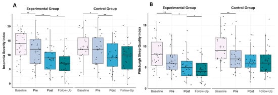 Boxplots showing the change in (A) insomnia symptoms assessed by the Insomnia Severity Index (ISI) and (B) subjective sleep quality assessed by the Pittsburgh Sleep Quality Index (PSQI). (A) In the experimental group (EG, n = 27), the severity of insomnia symptoms decreased significantly from baseline to pre-intervention as well as from pre-intervention to post-intervention (6 weeks later) and from post-intervention to follow-up (4 weeks later), whereas in the active control group (CG, n = 25), there was a trend of a decrease in the severity of insomnia symptoms from baseline to pre-intervention as well as a significant decrease from pre- to post-intervention. (B) In the experimental group, subjective sleep quality changed significantly from baseline to pre-intervention, from pre- to post-intervention and from post-intervention to follow-up, while in the active control group, subjective sleep quality decreased significantly from baseline to pre-intervention only. Higher values represent a stronger impairment in the respective measures. Horizontal lines represent the medians, and boxes represent the interquartile range, with whiskers depicting the 1.5 interquartile range. The black cross in the boxes corresponds to the mean. Baseline (T0), Pre-intervention (T1), Post-intervention (T2), Follow-up (T3). Asterisks indicate significance: ** p < 0.010, * p < 0.05, + p < 0.10.