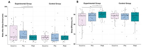 Boxplots showing the change in (A) objective wake after sleep onset (WASO) in minutes and (B) objective sleep efficiency (SE) in percentage assessed by ambulatory polysomnography. (A) In the experimental group (EG, n = 27), the time spent in wake after sleep onset decreased significantly from baseline to post-intervention as well as from pre- to post-intervention (6 weeks later). Higher values represent a longer wake after sleep onset duration. (B) In the experimental group, sleep efficiency increased significantly from baseline to post-intervention as well as from pre- to post-intervention (6 weeks later). Lower values represent worse sleep efficiency. Horizontal lines represent the medians, and boxes represent the interquartile range, with whiskers depicting the 1.5 interquartile range. The black cross in the boxes corresponds to the mean. Baseline (T0), Pre-intervention (T1), Post-intervention (T2). Control group (CG), n = 25. Asterisks indicate significance: ** p < 0.010, * p < 0.05.