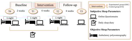 Study design. Participants’ sleep was assessed subjectively via questionnaires at baseline (T0), pre-intervention (T1), post-intervention (T2) as well as follow-up (T3). Furthermore, sleep was assessed objectively via ambulatory polysomnography at baseline (T0) as well as at pre- and post-intervention (T1–T2). A sleep diary was completed continuously during both the baseline and intervention period (T0–T2).