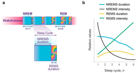 Despite significant progress in understanding the brain mechanisms involved in sleep regulation [1], the physiological function and dynamics of sleep within the sleep–wake homeostasis framework [2] remain uncertain and a topic of debate [3,4]. Sleep has a complex structure, known as sleep architecture, and, in humans, typically includes five to six sleep cycles per night (Figure 1a). Each sleep cycle consists of two types of sleep: it starts with nonrapid eye movement sleep (NREMS) followed by rapid eye movement sleep (REMS).