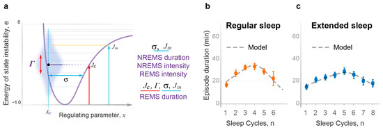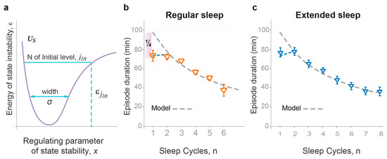 The wave model provides accurate quantitative description of dynamics in NREMS episode duration. (a). Two model parameters that allow us to describe NREMS episode duration (cyan solid line): —width of US potential and jin—order number (N) of the initial energy level at which sleep is initiated. —energy of state instability reached by the time of sleep initiation (cyan dashed line). (b). Regular sleep: NREMS episode durations. Dashed line—changes predicted by the model, orange triangles—experimental data (min, mean ± SEM) as a function of sleep cycle order number n (horizontal axis). Due to jin being populated at a variable point o (see Figure 3), the first experimental NREMS episode duration is, on average, ¼ shorter than the theoretical one for this energy level. Data collected in 24 young healthy subjects, 39 nine-hour nights (Method 16). R2 value: 0.905. (c). Extended sleep. Dashed line—changes predicted by the model, blue triangles—experimental data (min, mean ± SEM) as a function of sleep cycle order number n (horizontal axis). Data collected in 11 young healthy subjects over 308 fourteen-hour nights, as reported by Barbato and Wehr [30]. First NREMS episode duration is explained in (b). R2 value: 0.993.