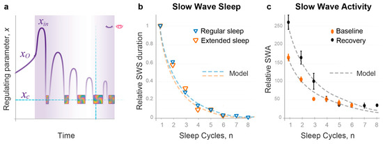 The wave model of sleep provides accurate quantitative prediction of dynamics of NREMS episode intensity. (a). Schematic of the time-dependent changes in the amplitude (L) of the regulating parameter of state stability, x (vertical axis), during sleep (purple area). xo—sleep onset, xin—amplitude of the first cycle, xc —equilibrium region of homeostatic threshold (horizontal dashed line), vertical dashed line—time of Uxc passage (see Figure 2), multicolor blocks—REMS episodes. (b). The decline in NREMS intensity is proportional to L2. Theoretical curves (dashed lines) and experimental data (triangles) for the decline in NREMS intensity (proportional to L2) over consecutive sleep cycles (n; horizontal axis) of regular sleep (orange, as in Figure 3b) and extended sleep (blue; as in Figure 3c; Barbato et al. [31]). Mean group data for slow-wave sleep duration are normalized to the first sleep cycle. R2 values: regular sleep: 0.973; extended sleep: 0.990. (c). The decline in NREMS intensity during baseline sleep and following 36 h sleep deprivation, as assessed using slow-wave activity (SWA/cycle, %), is proportional to L2. Theoretical curves (dashed lines) and experimental data (circles) for the decline in NREMS intensity over consecutive sleep cycles (n; horizontal axis) of regular baseline sleep (orange) and following 36 h sleep deprivation (black). Mean group data for slow-wave activity are from Dijk et al. [32]. R2 values: baseline sleep: 0.862; recovery sleep: 0.814.