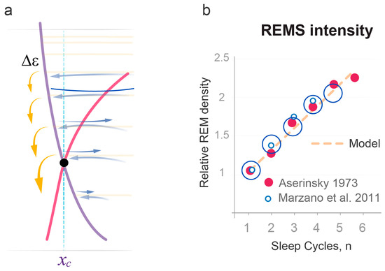 The wave model accurately predicts the slope of linear increase in REMS intensity. (a). Schematic of the region of homeostatic equilibrium between sleep and wake states (gray xc region in Figure 2, see caption for details) depicting linear increase in energy release (yellow arrows) that occurs in REMS due to linear increase in energy gaps between levels of Morse potential. (b). Rate of linear increase in REMS intensity (REM density) over consecutive sleep cycles documented in three similar but independent groups, as compared to theoretical prediction for a similar group by the wave model (orange dashed line). Group 1 (large open circle, n = 11 nights; R2 0.985; Method 16); group 2 in Aserinsky [34] (red circle, n = 20 nights, R2 0.961); group 3 in Marzano et al. [35] (small open circle, n = 50 nights; R2 0.997). Theoretical prediction was based on increase in energy gaps Δε over consecutive cycles, with no adjusting parameters used (n = 39 nights, as in Figure 3b). Mean group data for REM density are normalized to the first sleep cycle.