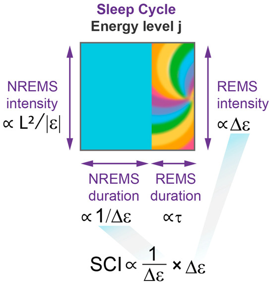 Wave model of sleep predicts sleep cycle invariant. Experimental sleep measures (purple font) are proportional () to the wave model parameters (black font). NREMS duration is to the period of x oscillation and thus inverse to the energy gap, 1/. NREMS intensity is to L2, where L is the amplitude of x oscillation and is the absolute value of wavepacket energy. REMS duration is to , the lifetime of coherent superposition. REMS intensity is to energy gap, . The model predicts that the sleep cycle invariant (SCI), being the product of NREMS duration and REMS intensity, should remain constant over consecutive sleep cycles. Cyan—NREMS, multicolor—REMS.