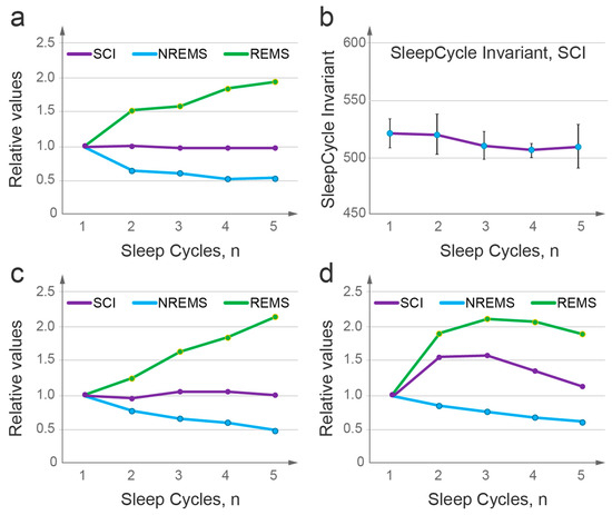 Despite NREMS duration and REMS intensity showing distinct dynamics over consecutive sleep cycles, the product of these two sleep measures (SCI) remained near constant over the course of the night (Figure 7a,b, p value > 0.92, see Statistical analysis in Methods). This confirmed the invariant relationship between NREMS and REMS over consecutive sleep cycles of normal high-efficiency sleep.
