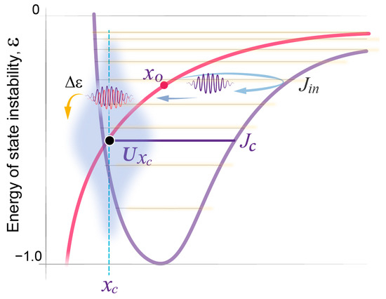 Figure 11 illustrates the time-dependent behavior of the only independent variable of the wave model, the regulating parameter x and the associated energy of state instability ε, which increase when the system’s stability is altered. In physics, the concept of a regulating parameter plays a fundamental role in the study of complex systems. It provides insights into a physical system’s behavior, properties, and transitions between phases or states. These regulating parameters can encompass variables like temperature, pressure, or internuclear distance in molecules.