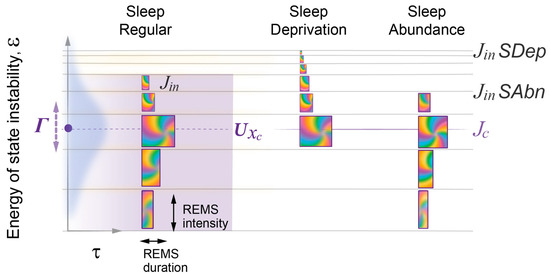 The wave model predicts the effects of sleep deprivation and sleep abundance on the duration and intensity of REMS episodes. Regular sleep: Maximal REMS duration (width of the multicolor blocks) occurs near resonance level Jc at the homeostatic energy threshold (Uxc, black dot, dashed line). Reductions in this experimental measure above and below the resonance level (gray area) are defined by resonance width (, vertical double-arrow). REMS episode intensity (height of the multicolor blocks) follows a linear increase in energy gaps between levels (horizontal gray lines) of the Morse potential. Sleep deprivation (SDep): following a prolonged wake state, sleep starts at a higher initial energy level (Jin SD), resulting in smaller initial duration and intensity of REMS episodes. If recovery sleep is of regular duration, awakening may occur before reaching or at the homeostatic threshold level, preventing the formation of a bell-shaped pattern of REMS episode duration. Sleep abundance (SAbn): following a brief wake state, with no prior sleep deficit, sleep is initiated at a lower initial energy level (Jin SA), increasing the initial duration and intensity of REMS episodes. Recovery sleep can be shorter than usual due to the relaxing energy of instability reaching the homeostatic energy threshold faster than in regular sleep.