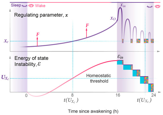 Time-dependent changes in the regulating parameter of state stability and energy of state instability. Top panel: Time-dependent changes in the regulating parameter of state stability x (vertical axis) over wake (white area) and sleep (purple area). In sleep, the period of x oscillations corresponds to the duration of consecutive NREMS episodes, while a decline in their amplitude squared corresponds to the drop in NREMS intensity. Each cycle ends around xc (horizontal cyan line), the region of sleep–wake equilibrium where REMS episodes occur (multicolor blocks). F—the driving force (red arrow) that increases x. Bottom panel: Time-dependent increase in the energy of state instability (vertical axis) over the wake state (white area) and stepwise decline over consecutive sleep cycles (block width—duration; NREMS—cyan; REMS—multicolor). Small reduction in at the start of wake period corresponds to sleep inertia. Maximal energy level reached () defines initial NREMS intensity. Linearly increasing portions of energy released correspond to REMS intensity (block height). Horizontal cyan line—potential energy of homeostatic threshold, U(xc). Vertical cyan line—timing of U(xc), with daytime timing around mid-afternoon peak in sleep propensity. Horizontal axis—time since awakening (hours).
