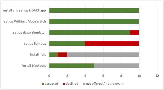 Some interventions were environmental and equipment-based; whether these were recommended and delivered by the therapist and the rate at which each was accepted is summarised in Figure 1.
