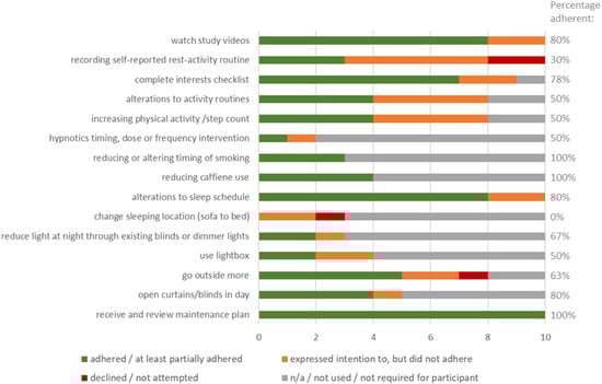 There were a large number of goals set regarding sleep schedule alterations, the nature of which varied depending on the sleep problem type. Overall, considering these can be difficult to adhere to, participants did well, and most made significant changes to their sleep schedule (after revisiting, if not immediately), some of which were sustained to the end of therapy and at follow-up. Various changes can be seen visually on activity plots, including participant 8 who increased consistency of sleep timing on weekdays and weekends (reduced sleeping-in and increased activity on weekend days), and participant 3 who tried out a very early wake time (6 am) during intervention, then settled on a consistent wake time of around 8 am by the end of the intervention period and during follow-up. Even those two participants, categorised as mostly not adhering in Figure 2 above, attempted changes in their sleep schedule briefly or intermittently, but which were not sufficiently sustained to be expected to improve sleep/sleep patterns and not continued by the end of therapy.