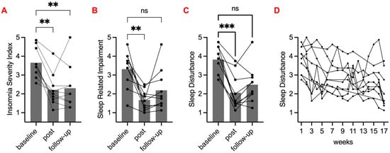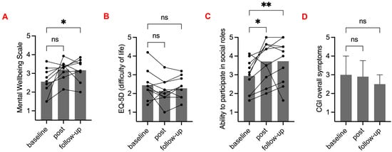 We used quantitative analysis (GraphPad Prism version 9, Boston, MA, USA) to compare self-report outcome measure scores and CGI-SCH between baseline, post-intervention, and follow-up, where there were no missing data. We used a non-parametric repeated measure statistical test: the Friedman test with Dunn’s multiple comparison against baseline. For Withings Move step counts and CamnTech MotionWatch 8 accelerometry and light exposure recordings, the data cleaning pipeline is described in Supplementary File S1. Descriptive statistics, non-parametric circadian variables, observed daily periods, and time-of-day distributions were calculated [,].