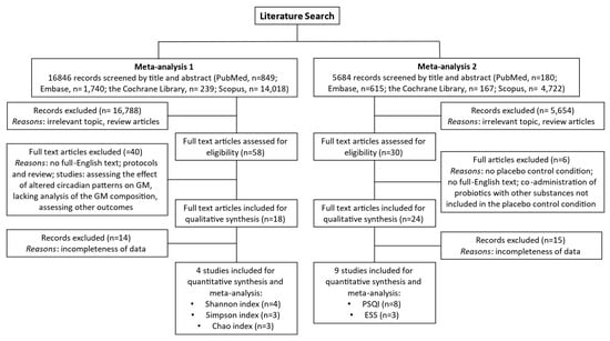 Study flow chart. The relationship between GM composition and sleep disorders (metanalysis 1) and the effect of probiotics on sleep disturbance (metanalysis 2) were assessed.