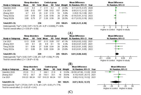 Forest plot for the mean difference of α-diversity. Patients with sleep disorders and healthy controls were compared, considering Shannon (A), Simpson (B), and Chao indexes (C). References in figure: Valentini 2020 [54]; Cai 2021 [65]; Zhang 2021 [52]; Tang 2022 [66].
