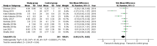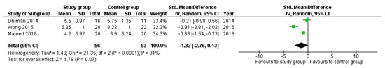 Forrest plot for the standard mean difference of ESS in study vs. control groups. References in figure: Dhiman 2014 [87]; Wong 2015 [88]; Majeed 2018 [89].