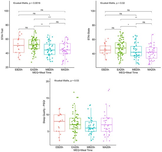 Anxiety and sleep quality according to chronotype and time of last meal. MEQ: Horne-Ostberg Morningness-Eveningness Questionnaire (chronotype). STAI: State-Trait Anxiety Inventory. PSQI: Pittsburgh Sleep Quality Index. EB20h: Evening types who eat before 20:00 h; EA20h: evening types who eat after 20:00 h; MB20h: morning types who eat before 20:00 h; MA20h: morning types who eat after 20:00 h. Significance level: p > 0.05; *: p ≤ 0.05; **: p < 0.01; ***: p < 0.001. ns: non-significant.