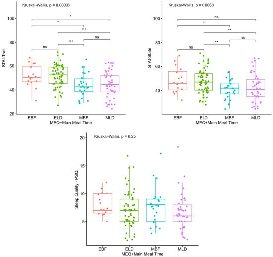 Anxiety and sleep quality according to chronotype and main meal time. MEQ: Horne-Ostberg Morningness-Eveningness Questionnaire (Chronotype). STAI: State-Trait Anxiety Inventory. PSQI: Pittsburgh Sleep Quality Index. EBF: Evening types who reported breakfast as main meal; ELD: evening types who reported lunch/dinner as main meal; MBF: morning types who reported breakfast as main meal; MLD: morning types who reported lunch/dinner as main meal. Significance level: p > 0.05; *: p ≤ 0.05; **: p < 0.01; ***: p < 0.001. ns: non-significant.