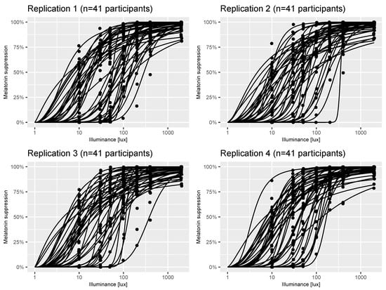 We developed a Bayesian statistical model of a virtual laboratory melatonin suppression experiment [22]. The model can be thought of as representing the melatonin suppression versus photopic illuminance [lx] curves (henceforth termed “dose-response curves”) across the population from which the original study participants were sampled. The model is stochastic, meaning that each virtual individual drawn from it will likely have a different dose-response curve. Figure 1 shows four replicates of a virtual experiment comprising participants in each case (the same sample size as the estimates in [22]). There are two types of stochasticity inherent in the model: individual-level variation in dose-response curve parameters; and measurement error when recording an individual’s melatonin suppression level at a single discrete illuminance value. These two sources of uncertainty are evident in Figure 1 by the variation in dose-response curves between subjects and the variation in measurements (black points) around them.