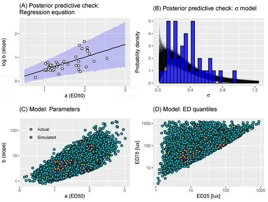 where and . We estimated the parameters in Equation (4) using the values of estimated by the root-finding algorithm. The model was estimated in a Bayesian paradigm, requiring that we set priors on the parameters. Here, we chose uninformative priors on the parameters, which are specified in Table 1. The model was fitted using Markov chain Monte Carlo (MCMC) through Stan’s NUTS algorithm [26] using 4 Markov chains with 2000 iterations per chain, with 1000 of each chain’s iterations discarded as warm-up. The same criteria were used to diagnose model convergence as for Equation (2). Posterior predictive checks of model fit indicated that the model was a reasonable fit to the data (Figure 2).