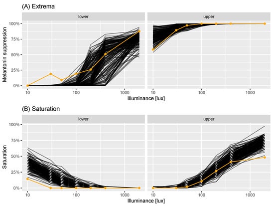 With both elements of the virtual experiment model in place—the population model of dose-response experiments and the measurement error model—we sought to assess how well the resultant model represented the data collected in [22]. This was tested using the minimum and maximum melatonin suppression at each measured illuminance value (the “extrema”); and the percentage of observations which were extreme at each lux: either below 5% lux or above 95% melatonin suppression (the lower and upper “saturation values”). We generated 200 replicate virtual experiments, which each had the same number of individuals () as the estimates we were provided with. For each experiment and illuminance value, we calculated simulated extrema and saturation values to compare with the real measurements. In Figure 3, we compare the modelled extrema (black lines) with the real values (orange points and line): in the left-hand plot, we compare the minima; in the right plot, we compare the maxima. This indicates that, for moderate-high illuminance values, the modelled and real values were in good accordance. At the lower illuminance values, the modelled values tended to be more extreme (either closer to 0% for the minima; or closer to 100% for the maxima) than the real data. In Figure 3, we performed the same comparison but for the levels of simulated and actual saturations. In this case, the upper saturation values between the modelled and real data were reasonable, apart from at the highest illuminance value measured. The lower saturations exhibited the same pattern as for the extrema, in that the simulated data were more extreme than the actual.