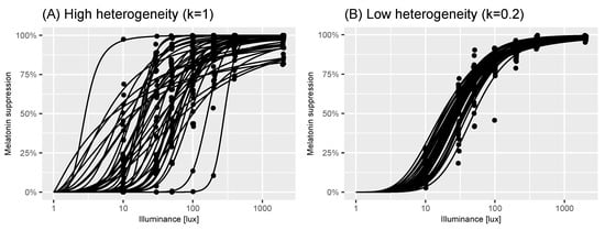 Effect of reduction in individual variance. Panel A shows individual dose-response curves and measurements (black points) of melatonin suppression at a series of illuminance values for participants generated using virtual-experiment (n = 41) function from the melluxdrc R package. Panel B shows the same but assuming a reduction in individual variance given by as given by virtual-experiment (n = 41, individual-variation-level = 0.2). The assumptions underpinning each of these panels are described in Section 5.