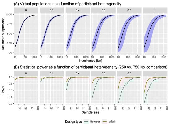 (A) Virtual populations as a function of participant heterogeneity. Here, we are simulating the group dose-response curves assuming different levels of participant heterogeneity. (B) Statistical power as a function of participant heterogeneity.