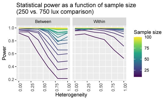 We show visualisations of the outcomes for these analyses in Figure 6 and Figure 7. Figure 6 shows the statistical power as a function of participant level hetereogeneity for between- and within-subjects designs. The same principle of power but for different illuminances levels is shown in Figure 7. The results are clear: within-subjects designs beat between-subjects designs.