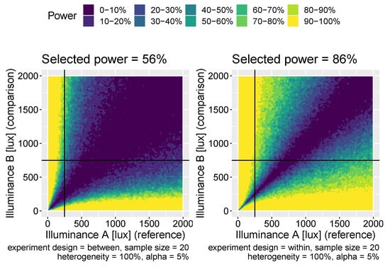 Power maps for two-illuminance comparison experiments for between-subjects (left panel) and within-subjects experiments (right panel). The choice of comparison light levels here is 250 and 750 lux.