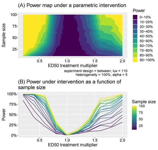 Panel (A) shows the power as a function of the intervention effect (expressed as a multiplier of the ED50 value) and sample size. Panel (B) shows a slice of the same data as a line plot for different discrete samples sizes.