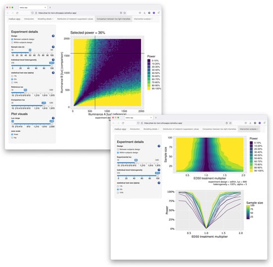 We provide an app developed in the Shiny framework which allows users to generate power analyses. The app is deployed at https://tscnlab.shinyapps.io/mellux-app/ (accessed on 1 February 2024). Screenshots are shown in Figure 9.