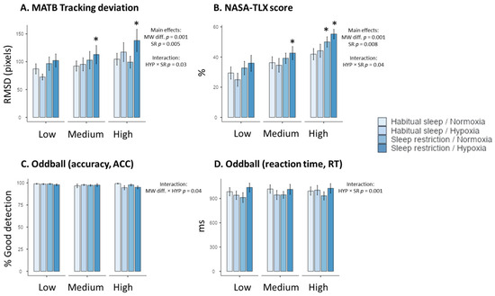 Performance to the MATB-II tracking task (A), NASA-TLX subjective scores (B), and accuracy (ACC) and reaction time (RT) to the auditory task ((C) and (D), respectively) in the four experimental conditions (Habitual sleep/Normoxia, Habitual sleep/Hypoxia, Sleep restriction/Normoxia, Sleep restriction/Hypoxia) and at the three MW difficulty levels (Low, Medium, High) * is a significant difference with the Habitual sleep/Normoxia condition, p < 0.05).