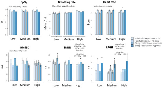 Changes in peripheral oxygen saturation (SpO2), respiratory (breathing rate), and cardiac parameters (heart rate and heart rate variability parameters) in the four experimental conditions (Habitual sleep/Normoxia, Habitual sleep/Hypoxia, Sleep restriction/Normoxia, Sleep restriction/Hypoxia) and at the three MATB-II MW difficulty levels (Low, Medium, High) * is a significant difference with the Habitual sleep/Normoxia condition, p < 0.05).