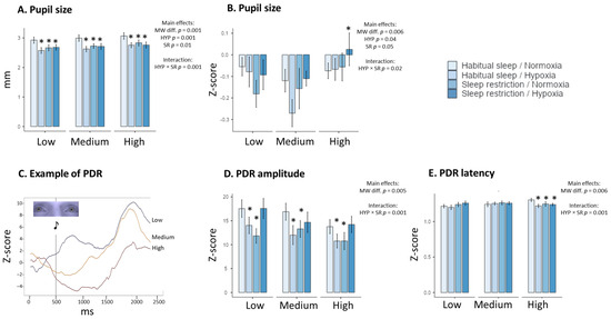 Changes in physiological Eye tracking parameters in the four experimental conditions (Habitual sleep/Normoxia, Habitual sleep/Hypoxia, Sleep restriction/Normoxia, Sleep restriction/Hypoxia) and at the three MATB-II MW difficulty levels (Low, Medium, High). Pupil size in raw values (A), pupil size in Z-score (B), an example of the Pupil Dilatation Response (PDR) at the three MATB-II MW difficulty levels (C), amplitude and latency ((D) and (E), respectively) of PDR. * is a significant difference with the Habitual sleep/Normoxia condition, p < 0.05).
