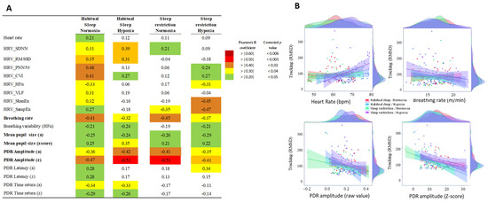 (A). Correlation analysis (with Pearson coefficient, R and P) between physiological parameters and MATB-II tracking performance in the four experimental conditions (Habitual sleep/Normoxia, Habitual sleep/Hypoxia, Sleep restriction/Normoxia, Sleep restriction/Hypoxia). Only parameters showing a significant correlation (corrected p < 0.05) with MATB-II tracking performance (RMSD value) in Habitual sleep/Normoxia were presented. p values take into account multiple comparison corrections [27] (B): examples of repeated-measures correlations between MATB-II tracking performance (RMSD values) and heart, breathing rate, and amplitude and Z-score of the PDR response in the four experimental conditions.