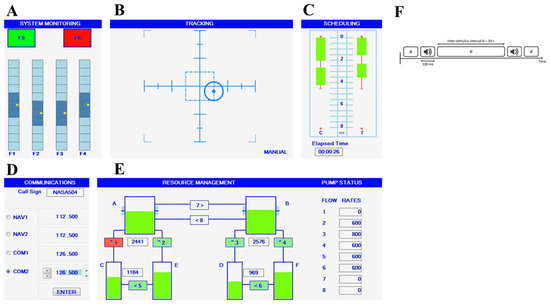 Illustration of the four subtasks of the Multi-Attribute Task Battery (MATB)-II and the auditory Oddball-like task: SYSTEM MONITORING (A) task in the upper left corner where participants had to respond as quickly as possible to scale fluctuations via keystrokes, TRACKING (B) task in the upper corner where participants had to keep a tracker as close to the center with a joystick, COMMUNICATIONS (D) task in the bottom left corner where participants had to only answer broadcast messages that matched their call signs and RESSOURCE MANAGEMENT (E) task in the bottom right corner that required participants to keep tanks’ levels as close to target level as possible (2500 for the left and 1000 for right) by managing eight pumps. AUDITORY ODDBALL-LIKE (F) task that requires ignoring frequent tone and detecting infrequent auditory stimulus. (C) A workload rating survey is not a task but an automatic evaluation of the temporal progression; no action is required.