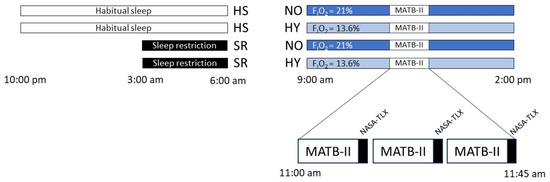 In our study, we didn’t observe any changes in the Tracking task performance of MATB-II during the hypoxia condition, which, however, corresponds to a moderate level of exposure (FIO2 = 13.6%, ~3500 m, SpO2 = 91.4%). Little is known about how multiple environmental stressors interact with MATB-II performance in complex environments (hypobaric chamber, sleep deprivation, etc.). Four-hour hypoxic exposition at 8000 ft (2438 m) and 10,000 ft (3048 m) [22] and at 13,000 ft (3962 m) [35] does not appear to impair MATB performance. Our study, conducted after 2 h of exposure to hypoxia with an equivalent at 3500 m (11,500 ft), confirms these results. However, we show that the combination of moderate hypoxia with sleep restriction (limited to 3 h TIB (time-in-bed)) decreases the MATB performance in comparison to normoxia and sleep restriction alone.