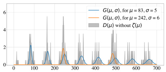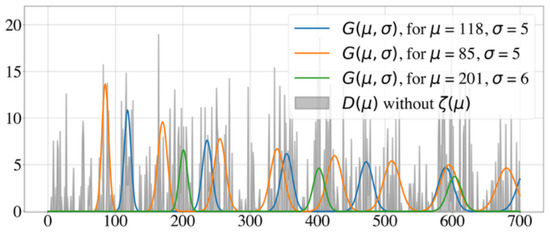 Further, we assume the starting point is zero, i.e., . For a time series of length , Equation (8) can be rewritten in a more explicit form by expressing the indicator function as a definite quantity. Assuming no missing values in , we should observe first-order intervals () in the time series, distributed according to the Gaussian probability density function (PDF) parametrized by and . For the second-order intervals (), the scaling factor would be , for , , and so on. Thus, for a single periodicity , the expected value of can be written for the Clock Model as: