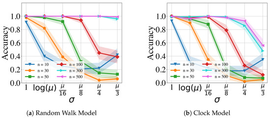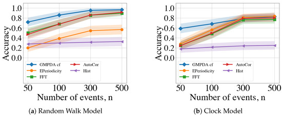 Here, we compare the performance of the GMPDA and of the alternative methods regarding an increase in noise. In the following figures, the accuracy of all the involved methods is plotted for , different number of events n, while it is averaged over all considered values of variance . The GMPDA with curve fitting consistently outperformed the alternative methods for different levels of noise for the Random Walk Model (Figure A3) for up to 500 events, and up to 100 events for the Clock Model (Figure A4).