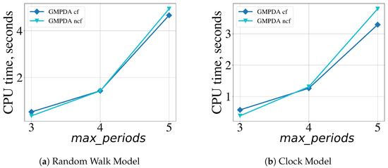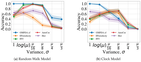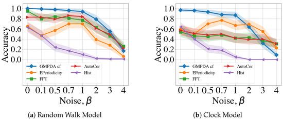 This section evaluates the capacity of the GMPDA to detect periodicities and variances on synthetic time series generated according to Clock and Random Walk Models. The performance of the GMPDA in detecting periodicities was compared with other periodicity detection algorithms, including FFT, autocorrelation with FFT, histogram with FFT, and E-periodicity (the alternative algorithms were implemented in MATLAB). For all algorithms, the minimal and maximal considered period lengths were set to 10 and 350, respectively. The corresponding code is available on https://github.com/nnaisense/gmpda (accessed on 18 July 2024)). These specific algorithms are described below.