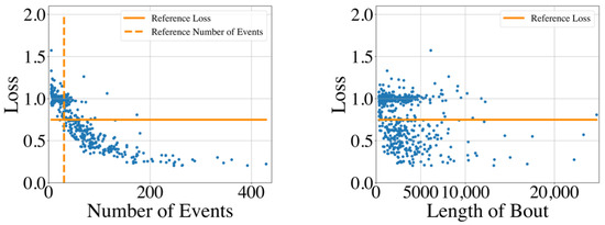 This section shows the GMPDA loss obtained with and without curve fitting for the MROS data set. Figure A7 shows the loss for 100 recordings in the left panel and the loss comparison for all single bouts in the right panel.