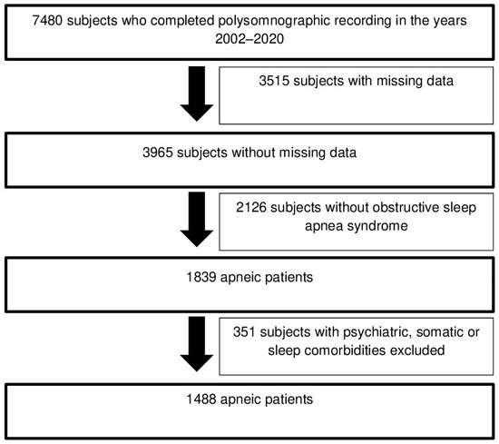Data from 1488 apneic patients who stayed at the Sleep Laboratory between 1 January 2002 and 31 December 2020 were extracted from the medical reports of polysomnographic recordings available in the database of the Brussels University Hospital (Figure 1). The criteria applied for the selection of these apneic patients are detailed in Table 4 [48]. Furthermore, we decided to focus only on apneic patients for this study, given the potential negative consequences associated with the occurrence of comorbid insomnia disorder in this particular subpopulation [3,4,5,6,7,8]. Finally, the description of the outpatient care journey for these apneic patients, from the specialized consultation for sleep medicine to their admission to the Sleep Laboratory, is detailed in the Supplementary Data—Annex 1 [26].