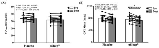 As shown in Figure 2A, there were no significant differences between the placebo and DAZZEON αSleep® groups before and after the 14-day intervention. As shown in Figure 2B, there were no significant differences between the placebo and DAZZEON αSleep® groups before the intervention. However, after the 14-day intervention, the DAZZEON αSleep® group showed a significantly reduced CRT mean, reduced by 10.38% (p < 0.001), and there was a significant time effect (F(1, 22) = 24.388, p < 0.001, η2 = 0.526).