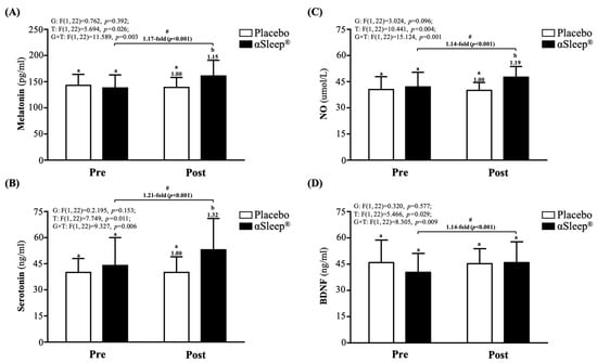 Effects of 2-week DAZZEON αSleep® intervention on (A) melatonin, (B) serotonin, (C) NO, and (D) BDNF. Data are expressed as mean ± SD. Different superscript letters (a, b) indicate significant differences at p < 0.05 at the same time point. # indicates a significant effect (p < 0.05) after 2-week intervention compared with before intervention.