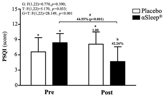 Effects of 2-week DAZZEON αSleep® intervention on PSQI score. Data are expressed as mean ± SD. Different superscript letters (a, b) indicate significant differences at p < 0.05 at the same time point. # indicates a significant effect (p < 0.05) after 2-week intervention compared with before intervention.