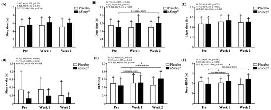 We recorded the subjects’ sleep quality each night using a wearable device and presented this as an average weekly recording (Figure 5). We found that there were no significant differences in weekly sleep time, light sleep time, deep sleep time, wake time, or rapid eye movement (REM) sleep time between the placebo group and the DAZZEON αSleep® group. However, after adding the deep sleep time and REM time, we found that after 14 consecutive days of the intervention, the DAZZEON αSleep® group showed a significant 1.28-fold (F(1, 22) = 6.805, p = 0.016) improvement compared with the placebo group. In addition, after one and two weeks of continuous recording, only the REM and REM + deep sleep times of the DAZZEON αSleep® group were significantly increased compared with before the intervention (p < 0.05). Light sleep (F(2, 44) = 4.213, p = 0.021, η2 = 0.161) and REM time (F(2, 44) = 5.137, p = 0.010, η2 = 0.189) showed significant time effects, and deep sleep (F(2, 44) = 5.351, p = 0.008, η2 = 0.196), REM (F(2, 44) = 15.010, p < 0.001, η2 = 0.406), and REM + deep sleep time (F(2, 44) = 15.008, p < 0.001, η2 = 0.406) showed significant group × time effects.