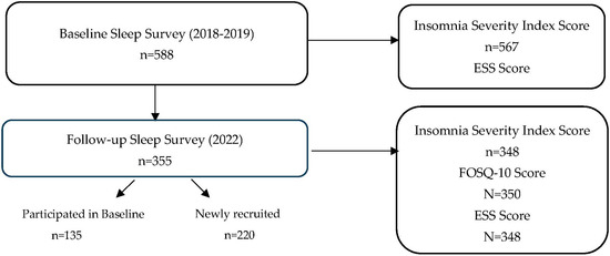 The prevalence of insomnia was 19.2% among participants (n = 567), with an Insomnia Severity Index score of ≥15 in the baseline survey conducted in 2018–2019 [7]. The follow-up survey was conducted in both communities in 2022. Three hundred and fifty-five individuals participated in the follow-up survey. Of those, 135 participated in both baseline and follow-up. Two hundred and twenty new participants participated in 2022 (Figure 1).