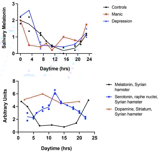 Circadian rhythmicity of melatonin, dopamine, and serotonin levels in mental disorders. (Upper panel): Circadian variations in salivary melatonin levels in controls, manic patients, and patients with major depression. (Lower panel): Levels of salivary melatonin, dopamine, and serotonin in the raphe nuclei of the Syrian hamster. The figure represents weighted median values based on information available in cited publications [49,78,79,80,81,82]. These values are presented in arbitrary units due to the use of different units for measuring neurotransmitter levels. The differences in neurotransmitter levels at various time points were determined by fold changes relative to time point zero. Please note the contrasting circadian rhythms of melatonin and serotonin. Melatonin data are derived from human subjects. For brain tissue analysis, we relied on studies of the Syrian hamster, whose circadian rhythms closely resemble those of humans.